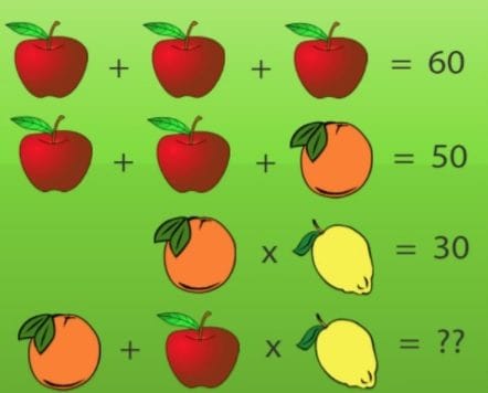 Brush up on Maths and solve the last operation. To do this, just guess what is the numerical value of each fruit.