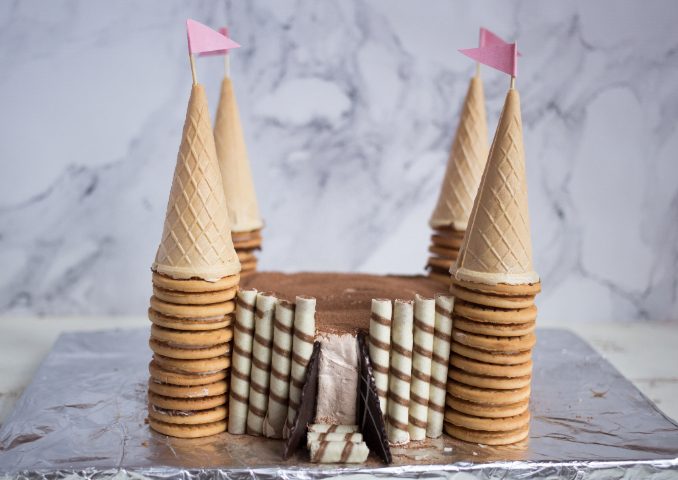 Make a walls of the castle with wafer sticks. Optionally use small pieces of chocolate to make gates.