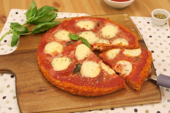 Pour the sauce into a saucepan with the water, the oil, the basil, the salt and the oregano. Then pour the rice and cook for about 13 minutes, turning frequently, being careful not to burn the rice on the bottom. Let the rice cool, then add the egg and the Parmesan. Mix everything and pour half of it into a baking pan of 24 cm (the smaller the pan, the higher your rice pizza). Stuff with melted cheese and cover with the remaining rice. Bake for 25 minutes at 200°, remove from the oven and add the sauce, the oregano, the basil and the mozzarella. Then bake for another 10 minutes and serve hot.