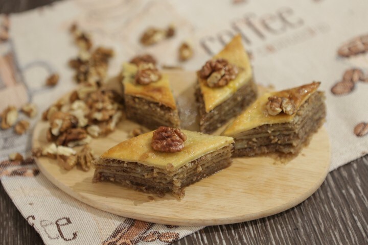 Chop the walnuts. Place first layer of dough on the dripping pan and grease with melted butter. Add chopped walnuts to the next layer and grease too. Repeat 5-8 times. Grease last layer with egg yolk with water. Cut into the correct shapes. Bake 180°C for 30 minutes. Pour with honey sauce.