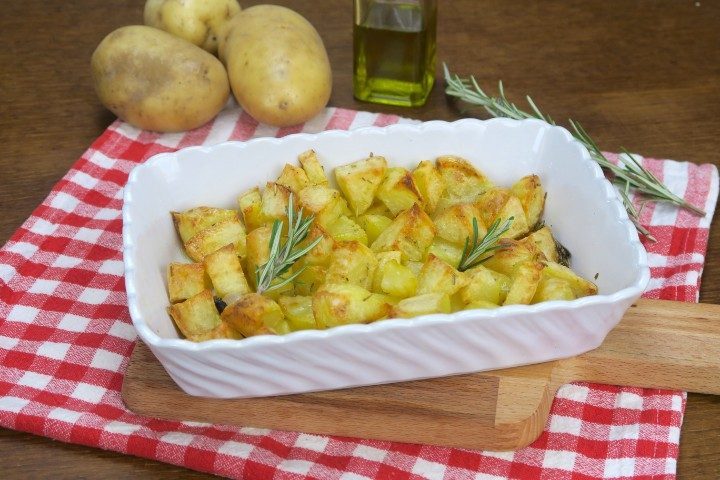 2. Cut the potatoes into cubes and let them soak in water for 30 minutes. Once they have released the starch, rinse them and boil them in water with a spoonful of vinegar for 5 minutes. Then boil them in salted water for 5 minutes, this will help keep the potato cubes from crumbling in the oven and it will also reduce baking time which will allow the potatoes to get crispy on the outside and soft inside.