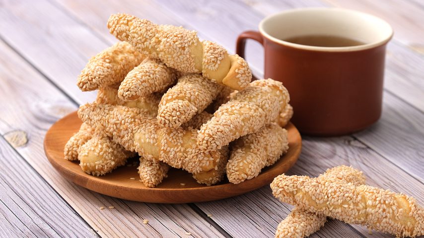 - Divide the dough into portions. Form the fingers with a skewer, brush with egg white and roll in sesame seeds. Place Sesame fingers on a baking sheet with parchment paper.