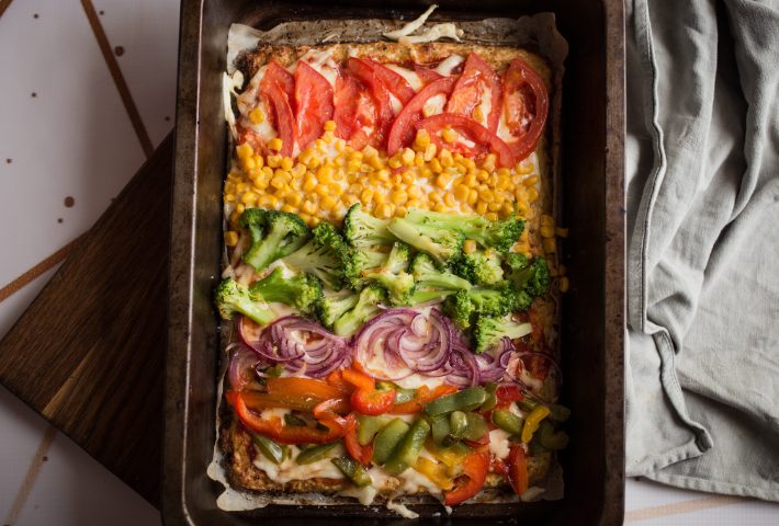 Cover cauliflower base with sauce and cheese, then top with vegetables of your choice, forming colorful strips across pizza base.