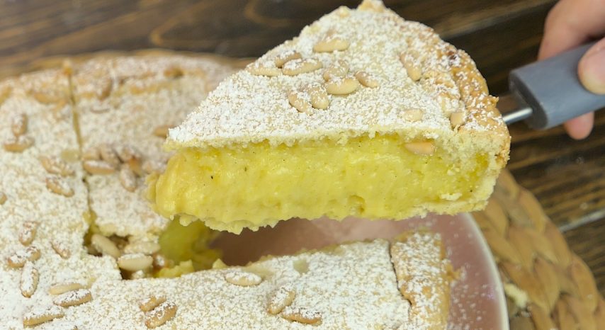 2. Stuff the pie with custard cream and decorate with pine nuts.