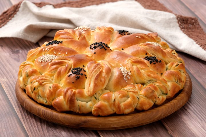 - Divide the third portion of the dough into 4 parts, roll out the cakes. Grease each cake with butter. Arrange and roll. Divide into 8 parts and form the leaves of the flower as shown in the video. Let rise. Grease with an egg. Sprinkle with sesame seeds.