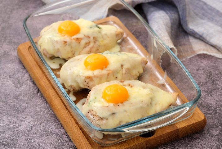 - Remove the toothpicks from the breasts. Sprinkle with cheese and put the yolk in each brisket. Bake for 5 minutes at 180 °C / 350 °F.