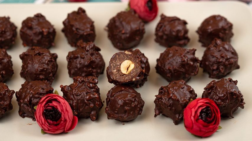- Melt butter with chocolate and add chopped hazelnuts into it.