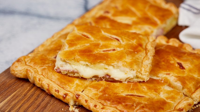 3. Top potato filling with ham and sliced mozzarella. Brush free edges with egg wash and layer another sheet of puff pastry on top. Pinch the edges of the pie and make small slits on top of it.