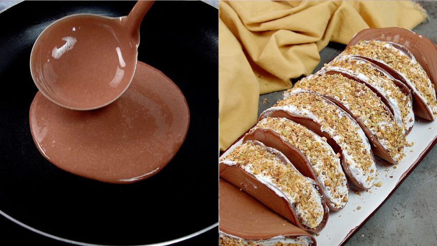 - Add a thick layer of cream on one half of the pancake. Fold in half and add chopped pistachios on top.