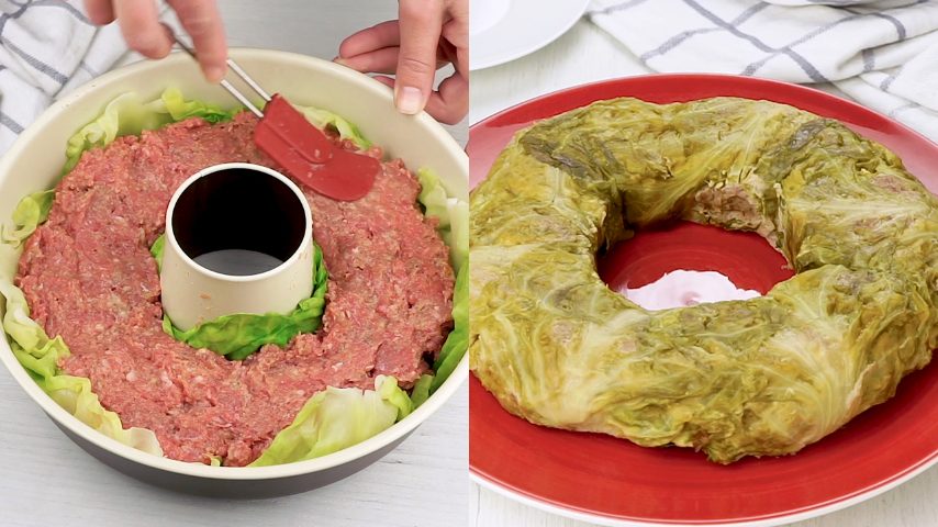 - Cut off all thick parts of the cabbage stems and line a donut mold with the prepared leaves.