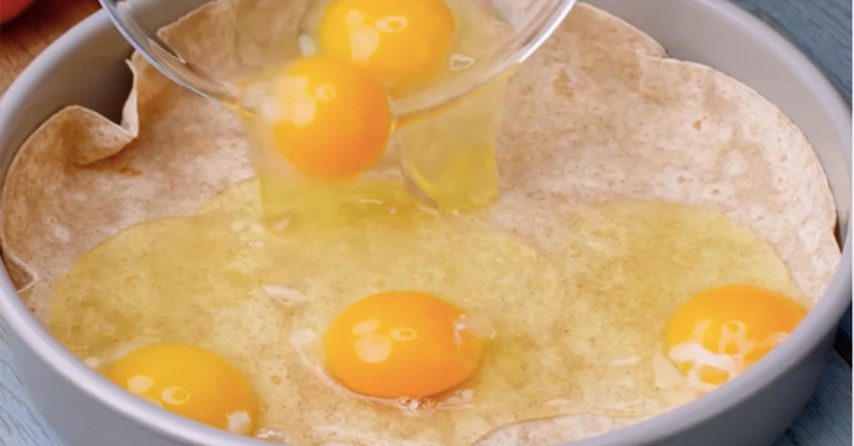 - Place tortilla into the pan, add in eggs, ham, parsley, Parmesan, salt, and pepper.